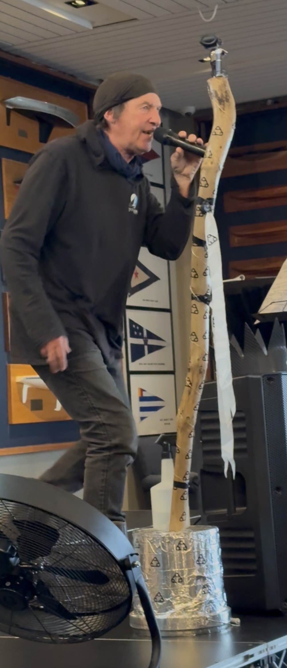 Over 90 people arrived at the RNZYS to hear the popular and iconic yachtsman and singer Andrew Fagan speak of his offshore adventures and misadventures in his tiny boat Swirley…