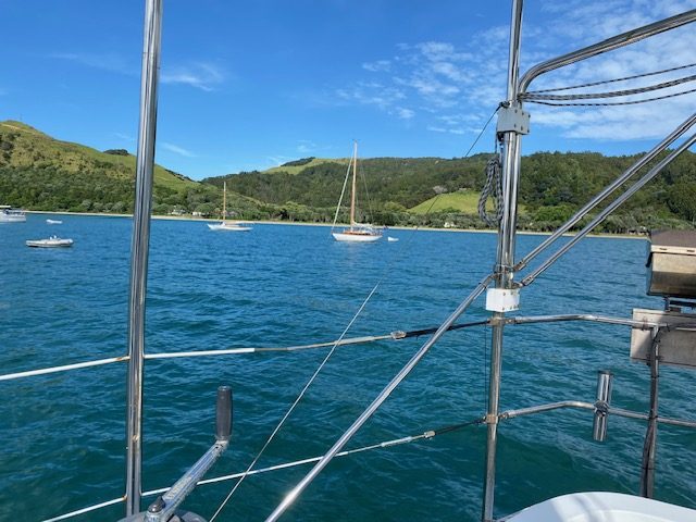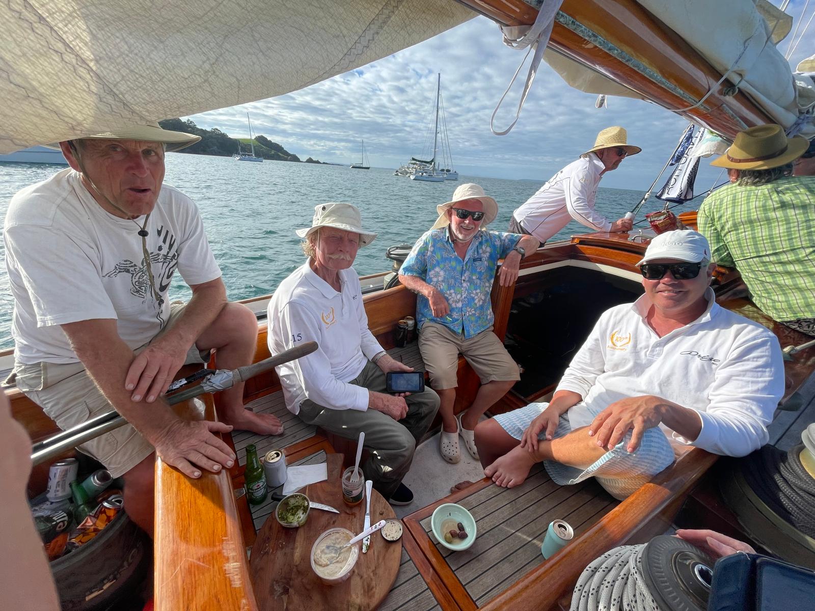 Eight boats sailed down with, or to meet Chad on Friday night at Man O’ War Bay, some arriving from different directions for a wonderful social evening aboard Tawera. Some crews dinghied over to the MOW vineyard for dinner and drinks, while others enjoyed the warm evening onboard — or even a refreshing swim.