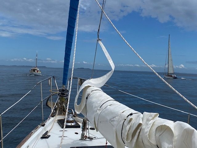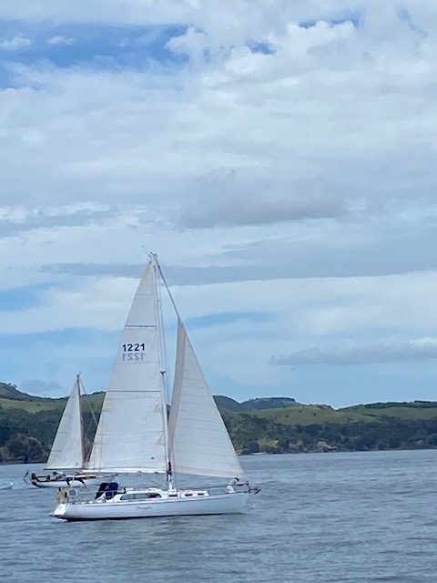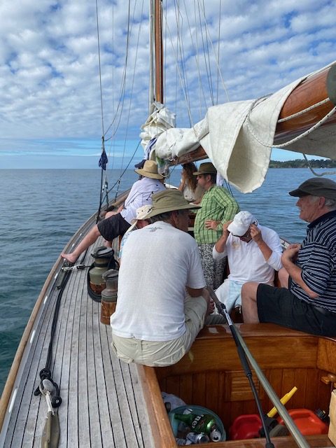 Eight boats sailed down with, or to meet Chad on Friday night at Man O’ War Bay, some arriving from different directions for a wonderful social evening aboard Tawera. Some crews dinghied over to the MOW vineyard for dinner and drinks, while others enjoyed the warm evening onboard — or even a refreshing swim.